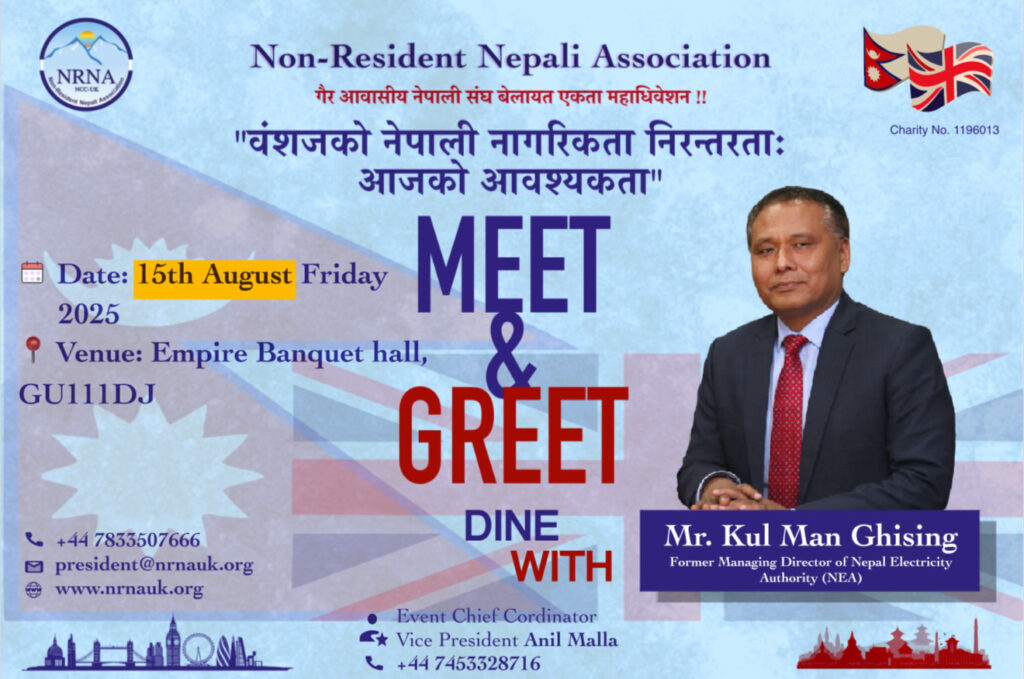 खाडी मुलुक हुंदै हाल अमेरिका रहेका उनी लन्डन समेत आउंदैछन् । छिट्टै बेलायत आउन लागेका कुलमानसंग एनआरएनए यूकेले आगामी १५ अगष्ट साँझ अल्डरसटस्थित एम्पायर हलमा ‘मिट एन्ड ग्रीट’ गर्ने तयारी गरेको छ । उनलाई पाइपर धुनका साथ स्वागत गरेर नागरिक अभिनन्दन गरिने छ ।